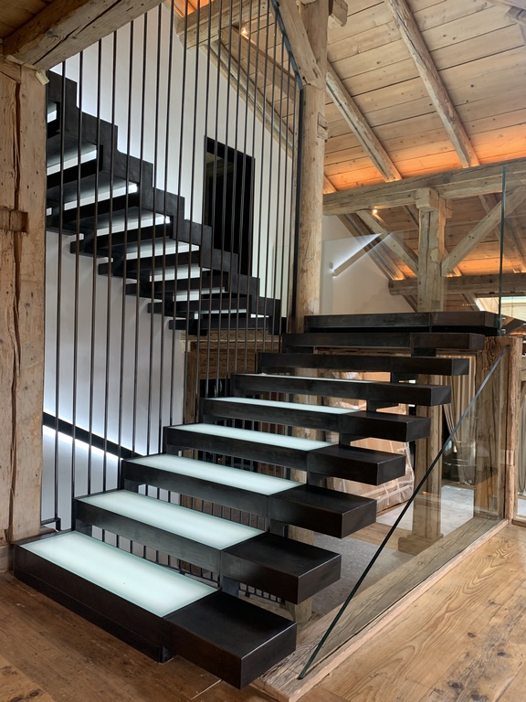 Les marches caisson en verre lumineux ajoutent une touche de magie à l’ensemble, captivant le regard avec leur lueur subtile. Chaque montée et descente devient ainsi une expérience sensorielle, mêlant l’éclat de la lumière à la noblesse de l’acier.