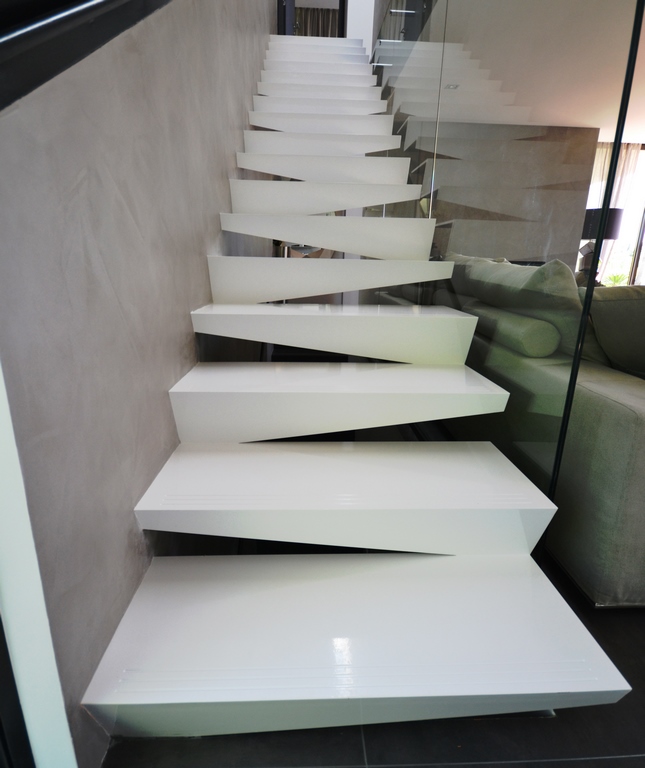 Chaque marche, découpée au laser avec une grande précision , évoque la délicatesse et la finesse d’un origami réalisé avec un ciseau expert. L’acier, façonné avec habileté, prend vie dans des formes géométriques élégantes et épurées, créant ainsi un jeu de lumière et d’ombre fascinant.