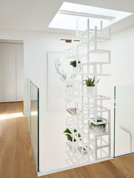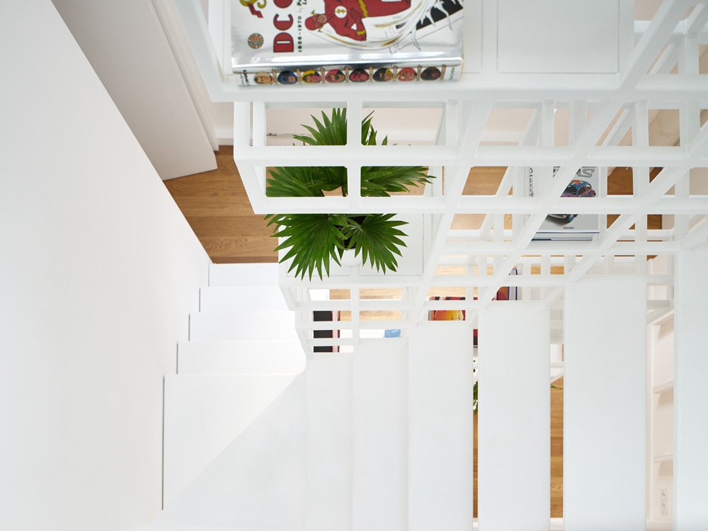 Conçu autour d’une structure en tube d’acier, il s’élève majestueusement dans une robe blanche éclatante, formant à la fois un escalier et une bibliothèque intégrée.